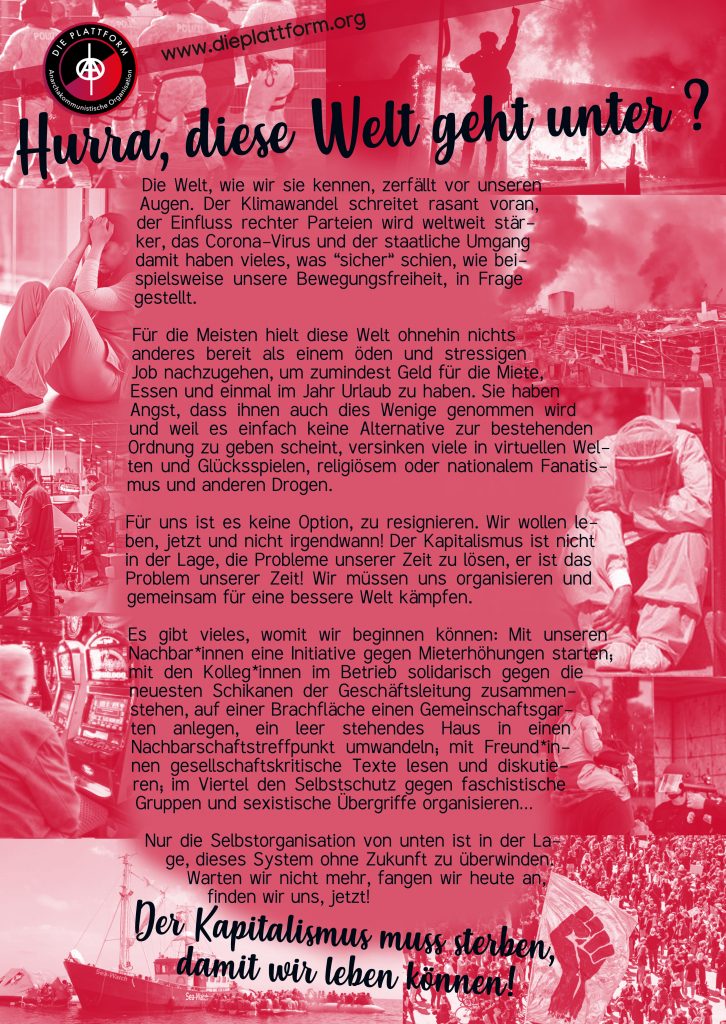 Unter dem Eindruck der Presseanfragen, die wir durch unsere Plakate aus Kleinstädten erhielten, haben wir ein neues Massenplakat designt. Wir wünschen uns eine möglichst große Verbreitung bis in die kleinsten Orte hinein. Insofern freuen wir uns auf eure Bestellungen, wenn ihr uns dabei unterstützen wollt, schreibt uns eine Mail an: kontakt@dieplattform.org