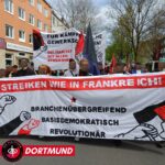 Am 1. Mai haben wir dann mit einem klassenkämpferischen Block auf der Demo des DGB in Dortmund teilgenommen. Dieser lief unter dem Motto „Streiken wie in Frankreich!“ und erregte mit lauten Parolen und großen Bannern viel Aufmerksamkeit. Der Reformismus und Zentralismus der DGB-Gewerkschaften und die Präsenz der Polizei“gewerkschaften“ auf der Demo wurde offen angeprangert.