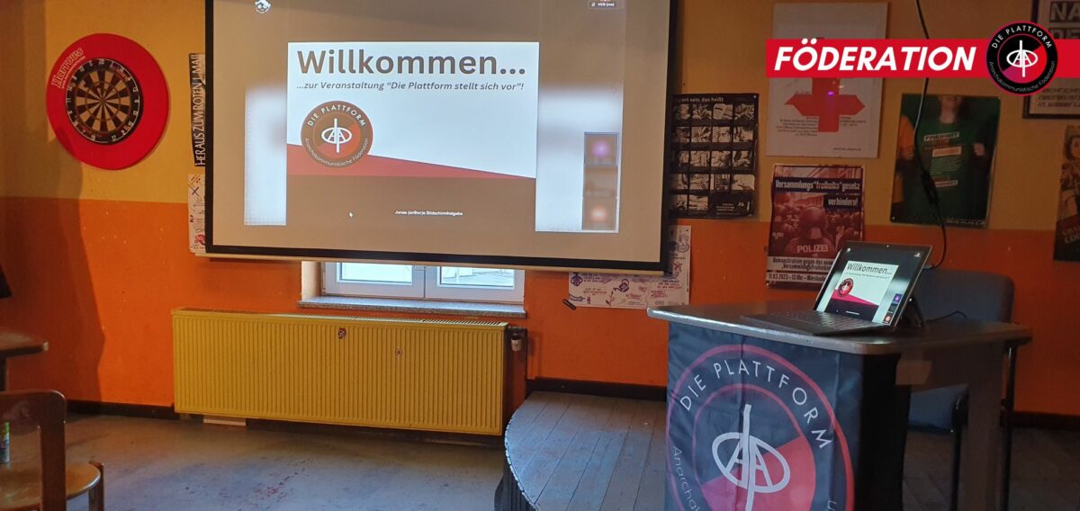 Die Plattform ist eine bundesweit organisierte anarchistische Föderation, die in den verschiedensten gesellschaftlichen Kämpfen aktiv ist. Unser Ziel ist der konkrete Aufbau von Gegenmacht, welcher es uns, der lohnabhängigen Klasse, ermöglicht, eine Gesellschaft frei von Herrschaft und Ausbeutung zu erkämpfen.